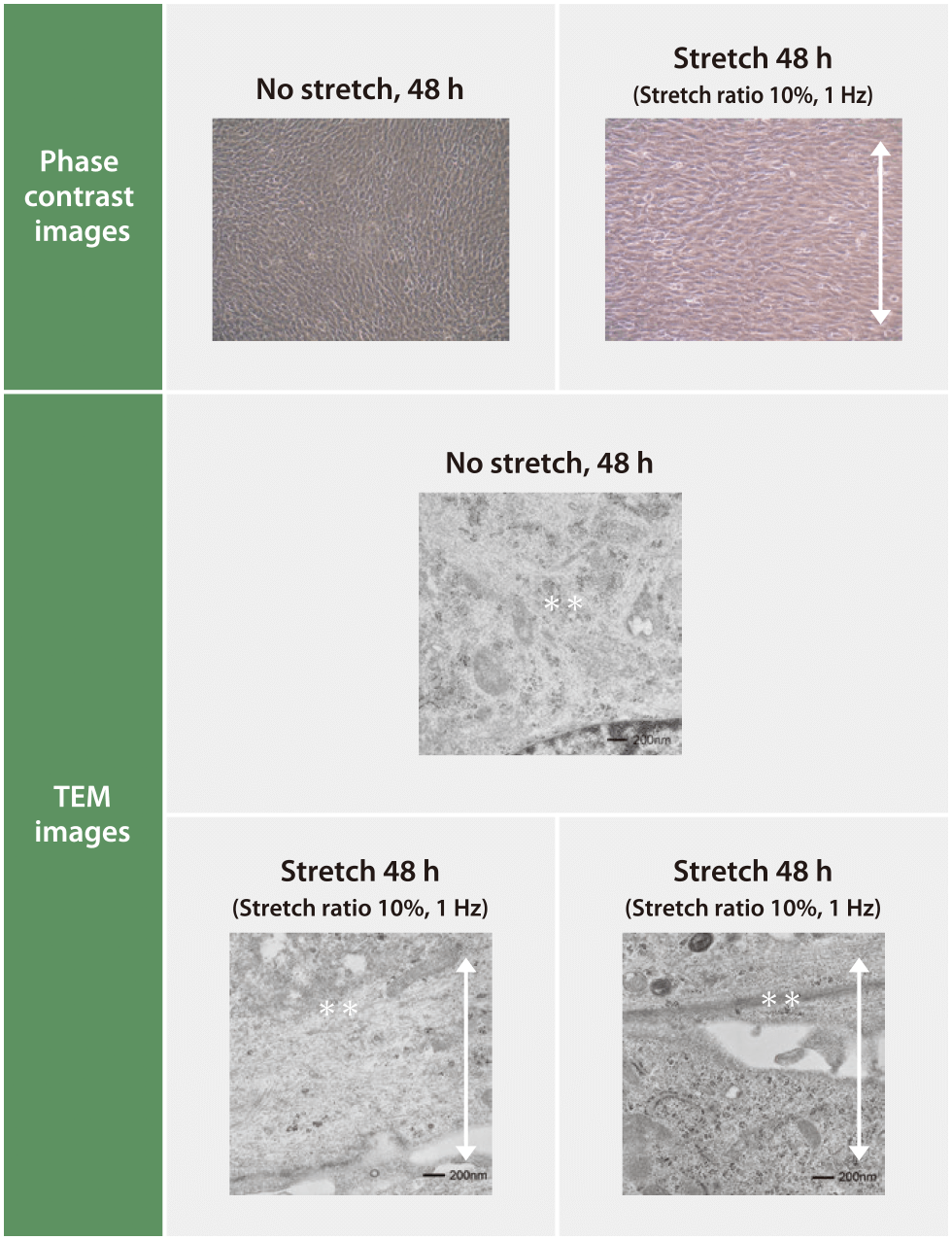 Transmission electron microscopy showed expressions of actin fiber perpendicular to the direction of stretching (twin asterisks at bottom left) and stress fiber by assembling of action fiber (twin asterisks at bottom right). White arrows show the direction of stretch.
